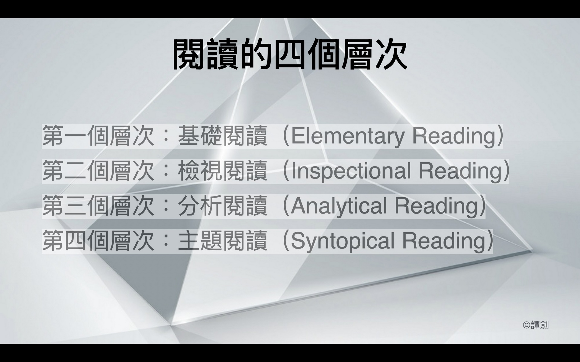 阿德勒在書中提出閱讀的四個層次:基礎閱讀、檢視閱讀、分析閱讀和主題閱讀。閱讀不同的書,或者有不同的目的,需要不同的方法。